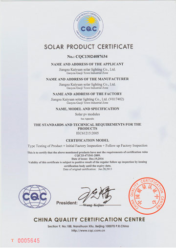 開元太陽能照明于2009年通過了ISO9001產(chǎn)品質(zhì)量體系認(rèn)證、環(huán)境管理體系14001認(rèn)證、職業(yè)健康與安全管理體系18001認(rèn)證,太陽能路 燈CQC認(rèn)證、金太陽認(rèn)證、CE證書、RoHS認(rèn)證、TUV認(rèn)證及世界多個國家認(rèn)可的鋰電池、太陽能路燈整套系統(tǒng)的CB認(rèn)證證書,多項產(chǎn)品通過了:lEC60598-2017、IEC61215:2016、IEC62619:2017、IEC61427等檢測,公司產(chǎn)品同時獲得了多項第三方機(jī)構(gòu)的檢測報告,成為了“國際研究機(jī)構(gòu)推薦的太陽能路燈市場主要參與者”。